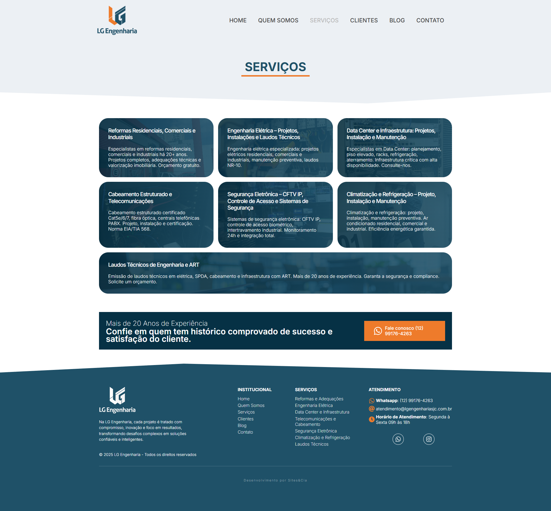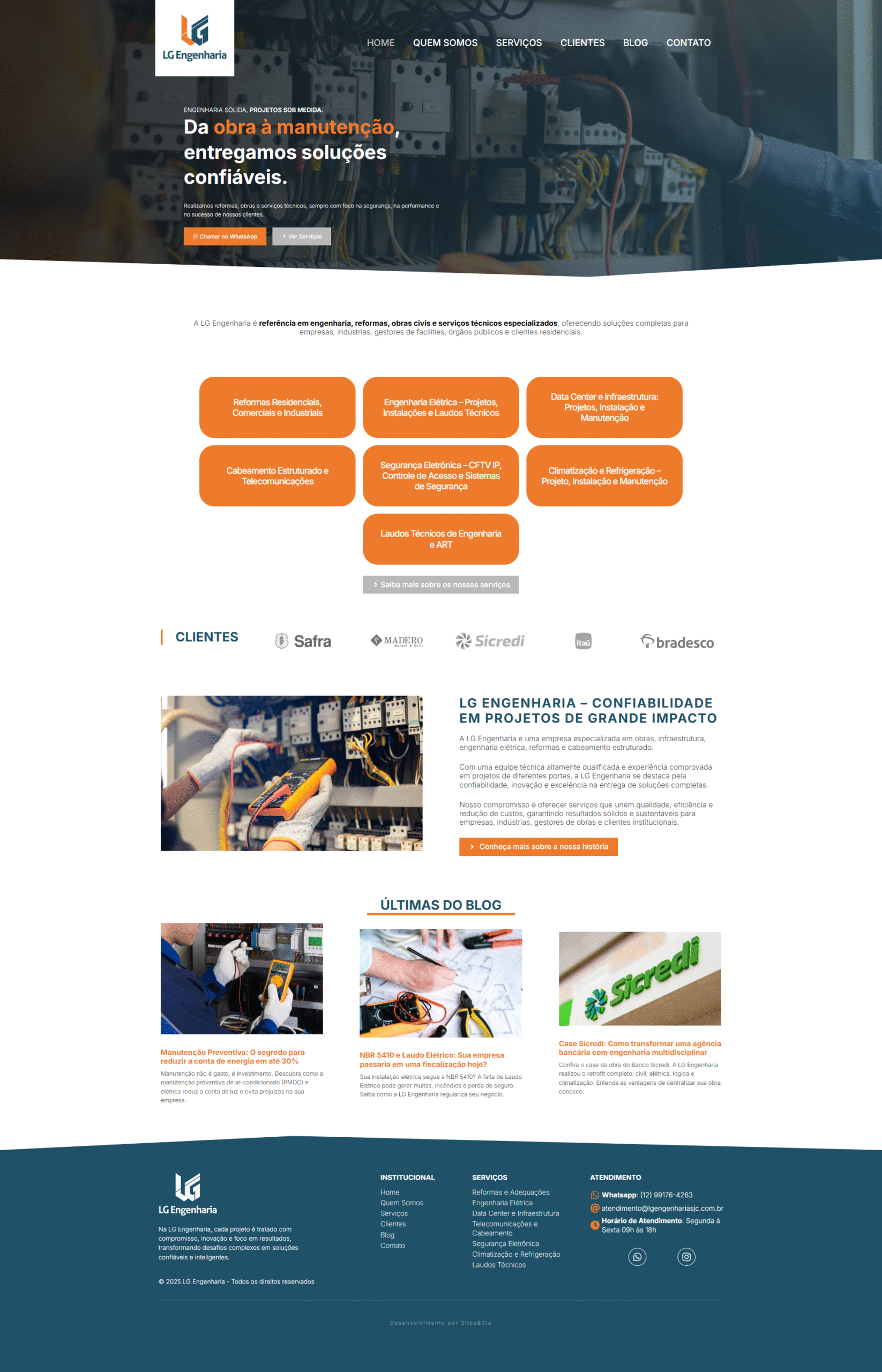 Para reforçar esse posicionamento, desenvolvemos um site institucional moderno, responsivo e intuitivo, pensado para apresentar com clareza o portfólio de serviços, os cases executados, as certificações e licenças, além dos diferenciais que consolidam a LG Engenharia como referência no mercado.